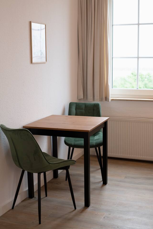 Ausstattung und Komfort: Der kombinierte Schlaf- und Wohnbereich ist mit einem großzügigen 180 cm Boxspringbett ausgestattet, das für erholsamen Schlaf sorgt. Zwei gemütliche Lounge- oder Ohrensessel laden zum Verweilen und Entspannen ein. Genießen Sie den modernen Komfort einer Pantry-Küchenzeile, die mit allem ausgestattet ist, was Sie für Ihre Mahlzeiten benötigen: Teller, Schalen, Tassen, Gläser, Weingläser, Besteck, Kochutensilien, Töpfe, eine Pfanne sowie zwei Induktionskochplatten und ein Kühlschrank bieten Ihnen die Freiheit, sich selbst zu versorgen. Unterhaltung und Annehmlichkeiten: Für Ihre Unterhaltung steht ein TV mit HDMI- und USB-Anschlüssen bereit. Das Apartment verfügt zudem über stabiles WLAN, sodass Sie jederzeit verbunden bleiben können. Eine Heizung sorgt auch in den kühleren Monaten für eine behagliche Atmosphäre. Besondere Merkmale: Unser Apartment befindet sich in einem historischen Kapitänshaus, das über 100 Jahre alt ist und den Charme vergangener Zeiten bewahrt hat. Die direkte Lage am Bodden und der herrliche Blick auf den Hafen verleihen Ihrem Aufenthalt eine besondere Note.